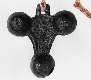 青銅製の鋳造品で逆三角形の剣菱形の各角に一箇ずつ鈴がつく形態で、鈴の中に小礫の珠が入っていて、振るとにぶい音がする。鈴の表面には隆線による円圏内に珠文が鋳出されており、とくに左鈴の頂点にある珠文は大きく乳首状となる。右と下の鈴にも同様の珠文が施されたらしいが、鋳型のくずれにより不明瞭である。背面には文様はない。また、剣菱体の表面の偏平な円圏内は、二条の隆線で十字に四分割され、やはり全体に珠文が配されている。交差する二条の隆線中央部の珠文は大きめである。
